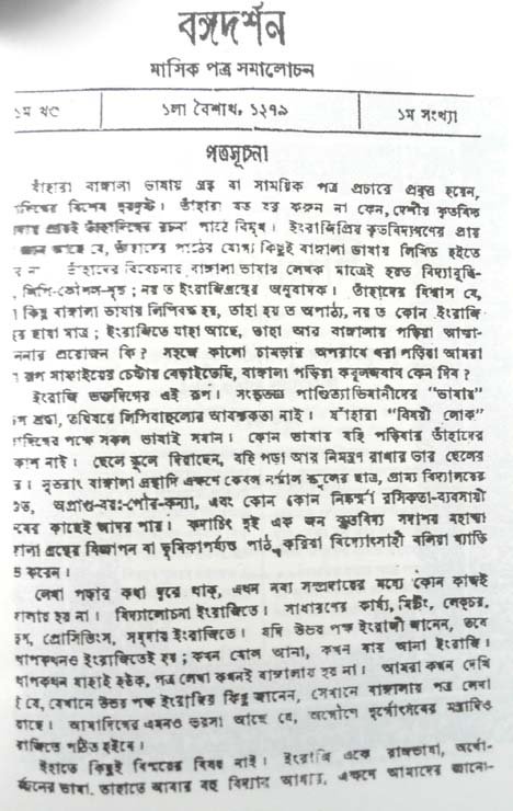 “ যাঁহারা বাঙ্গালা ভাষায় গ্রন্থ বা সাময়িক পত্র প্রচারে প্রবৃত্ত হয়েন, তাঁহাদিগের বিশেষ দুরদৃষ্ট। তাঁহারা যত যত্ন করুন না কেন, দেশীয় কৃতবিদ্য সম্প্রদায় প্রায়ই তাঁহাদিগের রচনা পাঠে বিমুখ। ইংরাজিপ্রিয় কৃতবিদ্যগণের প্রায় স্থির জ্ঞান আছে যে, তাঁহাদের পাঠের যোগ্য কিছুই বাঙ্গালা ভাষায় লিখিত হইতে পারে না। তাঁহাদের বিবেচনায় বাঙ্গালা ভাষায় লেখকমাত্রেই হয় ত বিদ্যাবুদ্ধিহীন লিপিকৌশলশূন্য; নয় ত ইংরাজি গ্রন্থের অনুবাদক। .......