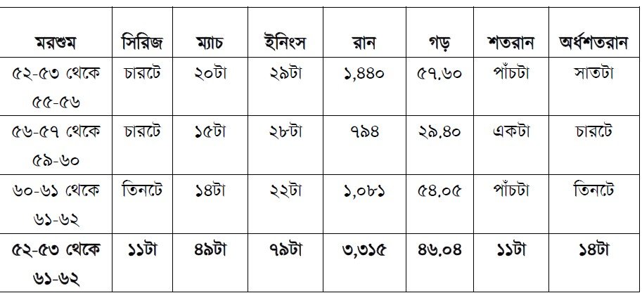 ব্যাটার পলি-র টেস্ট-জীবনের বাকি এক দশকের একটা প্যাটার্ন দেখানোর চেষ্টা করি। এই সময়টাকে, ১৯৫২-৫৩ মরশুম থেকে ১৯৬১-৬২ মরশুমকে, মোটামুটি তিন ভাগে ভাগ করি – লক্ষ করুন তাঁর ফর্মের ওঠা-পড়া।