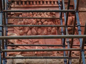 মন্দিরের ভিতরে ভাস্কর্যগুলো ছিল রিলিফের কাজ, বাইরের দেয়ালের কাজগুলোও রিলিফই কিন্তু দুইয়ের মধ্যে পার্থক্য আমার মতো সাধারণ মানুষেরও চোখে পড়ে। এক একটি আলাদা আলাদা ব্লক গ্রানাইট, তা প্রায় ১মিটার বর্গাকার আকারের হবে, পাশাপাশি ও ওপর নিচে সাজিয়ে দেয়াল গাঁথা হয়েছে। প্রায় প্রতিটি ব্লকে ভিন্ন ভিন্ন কাজ। আর যে পার্থক্যের কথা বলছিলাম তা হল এগুলো সমস্ত হাই-রিলিফের কাজ। ভাষায় বর্ণনা করার চেষ্টা করছি না, সঙ্গের ভিডিও ক্লিপ এই তফাৎ বোঝানোয় সাহায্য করবে আশা করি।