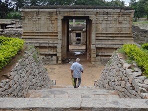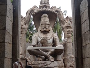 এবার দেখতে এলাম “নরসিংহ মন্দির।” মন্দির বলা যায় কি না আমার সন্দেহ হয়, কারণ নরসিংহ বা উগ্র-নরসিংহ এখানে সিংহাসনের মতো এক জায়গায় বসে আছেন, ঘেরা কিছুটা থাকলেও ছাদ নেই মূর্তির সঙ্গে। এই মূর্তি ৬.৭০ মিটার উচ্চের আর নির্মিত হয়েছে একটি বিরাট গ্রানাইটের ব্লক থেকে । কৃষ্ণদেবরায়ের রাজত্বকালে ভাস্কর কৃষ্ণভট্ট দ্বারা ১৫২৮ খ্রিষ্টাব্দে নির্মিত হয় এই মূর্তি লক্ষ্মী-নরসিংহ রূপে। কোনও এক সময়ে নরসিংহ, লক্ষ্মী-হারা হয়ে গেছেন। এখন নাকি লক্ষ্মীদেবীর ডান হাত নরসিংহের বাম কাঁধে দেখা যায়। আমি অবশ্য সেই হাত দেখতে পাইনি। নরসিংহের দুই হাঁটু, পাথরের এক পাটাতনে জোড়া রয়েছে এখন। এই পাটাতন কবে নির্মিত যদিও জানা নেই কিন্তু Sewell-এর বই-এ যে ফটোগ্রাফ আছে তাতে এই ‘বাঁধন’ নেই। এই মূর্তি, বিজয়নগর শৈলীর উৎকৃষ্ট ভাস্কর্যের উদাহরণ হিসাবে বিচার করা হয়ে থাকে।