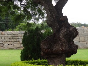 বিরাট জায়গা নিয়ে বাগান, মাঝ দিয়ে চওড়া লাল মোরামের রাস্তা। কিছুটা এগোতেই বাঁ দিকে উঁচু বেদি। তার ওপরে এককালে প্রাসাদ ছিল, এখন ফাঁকা। লেখা রয়েছে বোর্ডে, “Basement of Queen’s Palace।” কয়েক পা দূরে ডান দিকে ফাঁকা জায়গার ওপর “লোটাস মহল,” মনে হল এই নামও নতুন দেওয়া। অবশ্য বলা আছে এর আর এক নাম, “চিত্রাঙ্গী মহল।” আমার মনে হয় এইটিই আসল নাম। বিশেষ করে এর ভিতরে প্লাস্টারে দেব-দেবী ইত্যাদির চিত্র রিলিফে করা আছে। যাই হোক, এই মহলের নিচের দিক বিজয়নগরের গঠন শৈলী অনুযায়ী নির্মিত কিন্তু উপরের অংশ ইসলামিক শৈলীর পরিচায়ক। বলা হয় যে ঠাণ্ডা রাখার জন্য এই মহলের ওপরের দিকে জল-বাহি নলের ব্যবস্থা আছে, যদিও আমি দেখে বুঝতে পারিনি। মহলে খিলান সহ বড় বড় থাম, আর তার নিচে প্রশস্ত বারান্দা। খিলানে প্রচুর সুন্দর মটিফ, প্লাস্টারে করা। মহলের সামনে বেশ খানিকটা ঘাসে ঢাকা মাঠ। এদিক সেদিক কয়েকটা বড় ও প্রাচীন গাছ। বিশেষ করে একটা নিম গাছের মনে হল কৃষ্ণদেবরায়ের সঙ্গেও আলাপ ছিল। কেন বলছি? গাছটার ছবি দেখুন, বিশেষ করে গাছের গোড়া । (স্থানাভাবে লেখকের পাঠানো সব ছবি দেওয়া গেল না)
